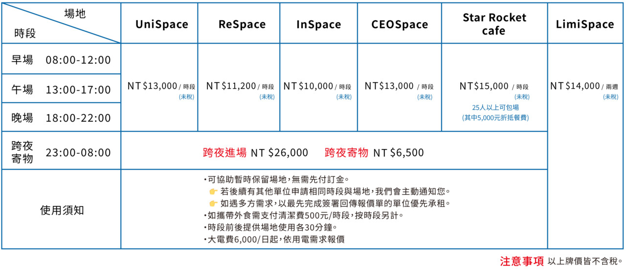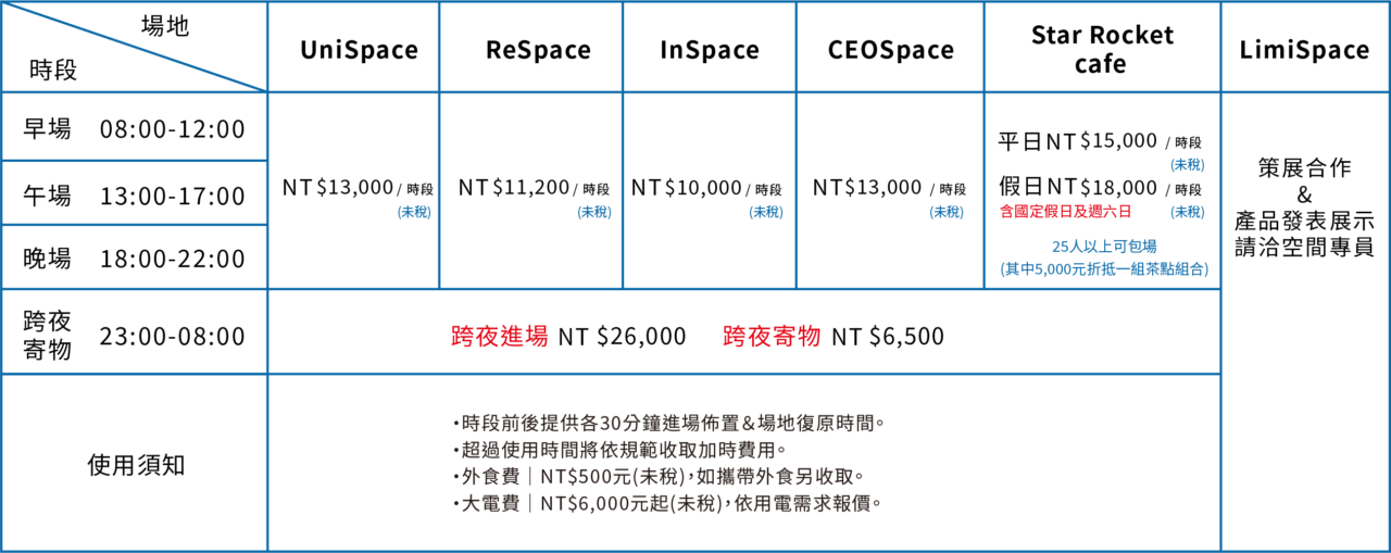 活動空間 UniSpace 佔地40坪的挑高活動場地,擁有面向華山大草原的整面落地窗、大面採光與美麗的夕陽景、完整的音響及投影設備,適合講座、論壇、工作坊、黑客松等活動。 InSpace 隱密性良好的培訓空間、完整的音響及投影設備,課程、工作坊、會議都非常適合的空間。 ReSpace 隔音良好的媒體空間,打造最優質的課程體驗,適用於會議、錄音、錄影、工作坊等需求洽詢。 StarRocket Cafe 共想咖啡吧! 專為社交、交流設計的場域。現代簡潔工業風內裝與吧檯設計,開放空間讓參與者享受輕鬆交流氛圍。提供飲品與餐點訂購,讓您預訂場地時無後顧之憂。 CEO Space 決策會議與戰略會談首選場地 多元應用 — 清晰簡報展示,確保最佳溝通效果。 LimiSpace 位於咖啡廳出入口的10坪空間,適合作為品牌的展覽空間,開放空間增進品牌曝光、接觸人流,同時還能舉辦試飲、手作課程,透過銷售增加收入。