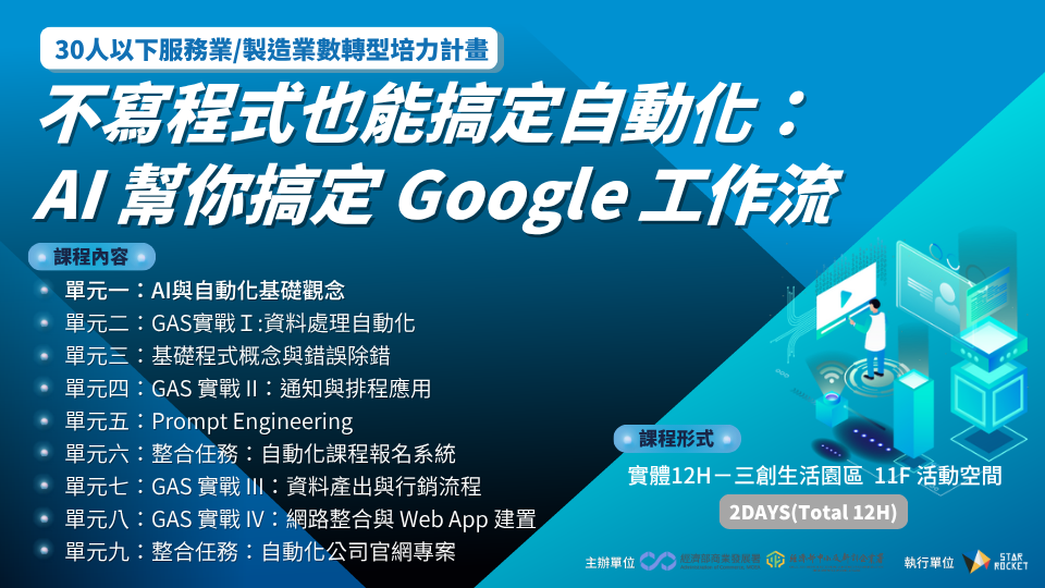 該堂課程專為日常使用 Gmail、表單、文件等 Google 工具,且工作中有大量重複性操作、需提升效率的團隊設計,並呼應「數位轉型 × 自動化 × AI 應用」三大方向,協助服務業者突破人力瓶頸與重工痛點,快速導入AI自動化工具,升級工作效率與流程管理能力。
