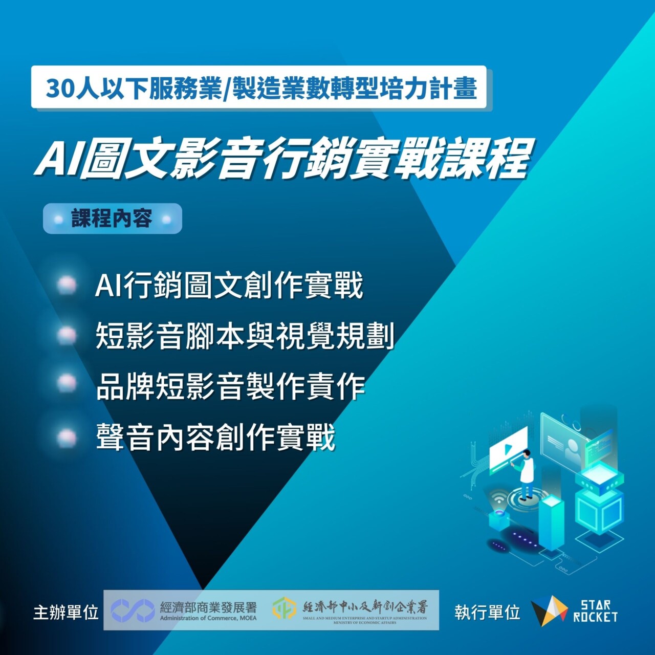 課程採實體與線上錄播進行,內容涵蓋從文案與品牌視覺設計,到影音與聲音內容製作,協助學員全面建構跨媒體行銷能力,強化企業在多平台行銷環境中的觸及率與轉換效益。