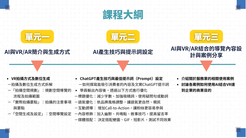 本課程從行銷實務出發,說明在沉浸式體驗與生成式AI成熟的背景下,品牌如何透過AI 與VR/AR雲端平台,將行銷內容由「單向展示」升級為「可互動的數位導覽體驗」。