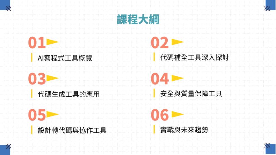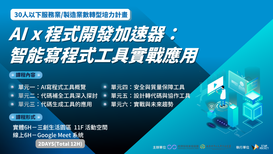 課程介紹AI寫程式工具的演變及現狀,涵蓋代碼補全與生成的應用與分析,強調安全性的重要性並分享實踐經驗,並探索設計轉代碼技術及協作方法,提升團隊效率。透過實戰練習掌握AI增強型IDE的應用,並分析未來趨勢,為學員職業發展提供指導。