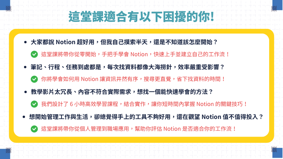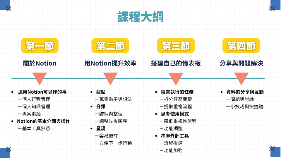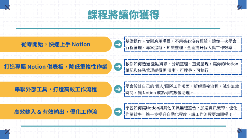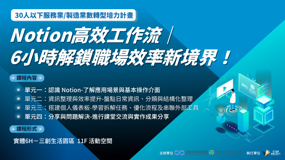 在職場中,我們每天都面對大量任務、專案、訊息與知識碎片,如何有效整理、串聯並迅速找到關鍵資訊,已成為影響工作效率的關鍵。課程將從個人管理與職場應用兩大面向出發,帶你全面掌握 Notion 的核心功能,打造系統化的數位工作流,提升專注力與執行力,讓你的工作更有條理、更高效。