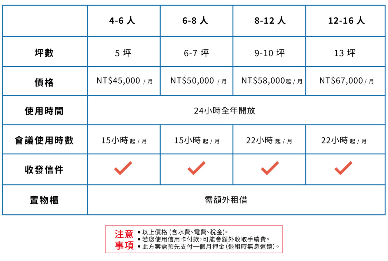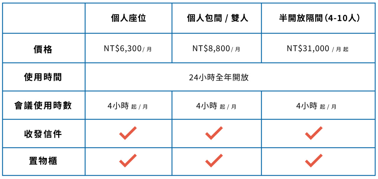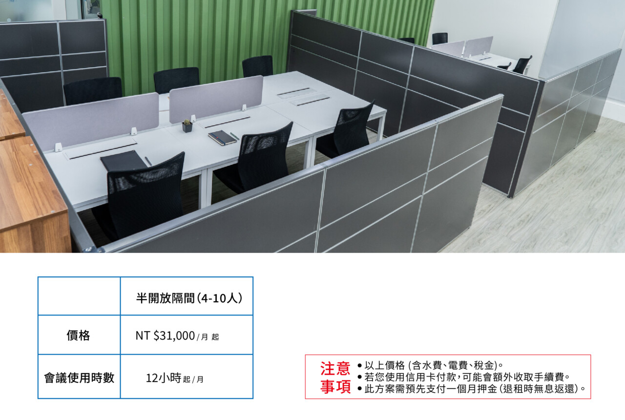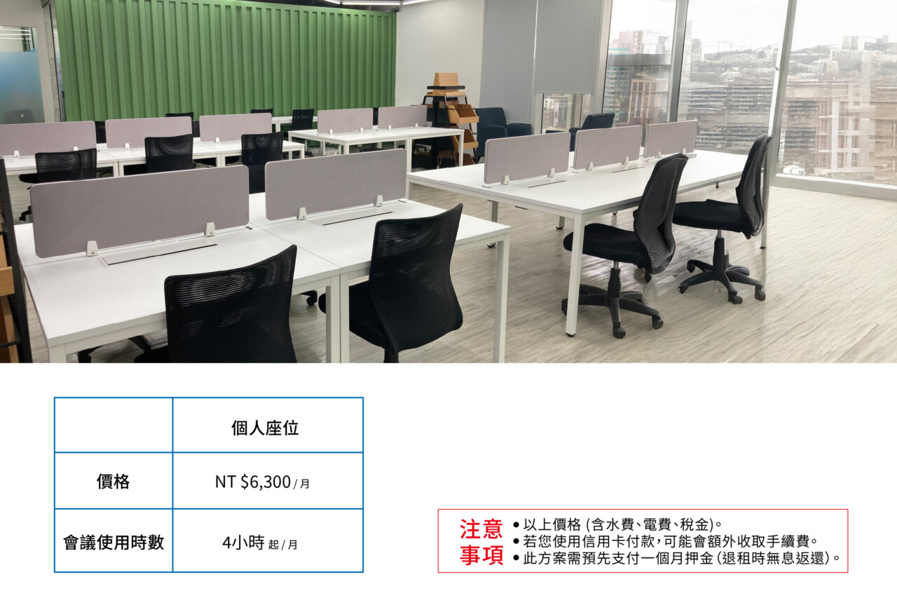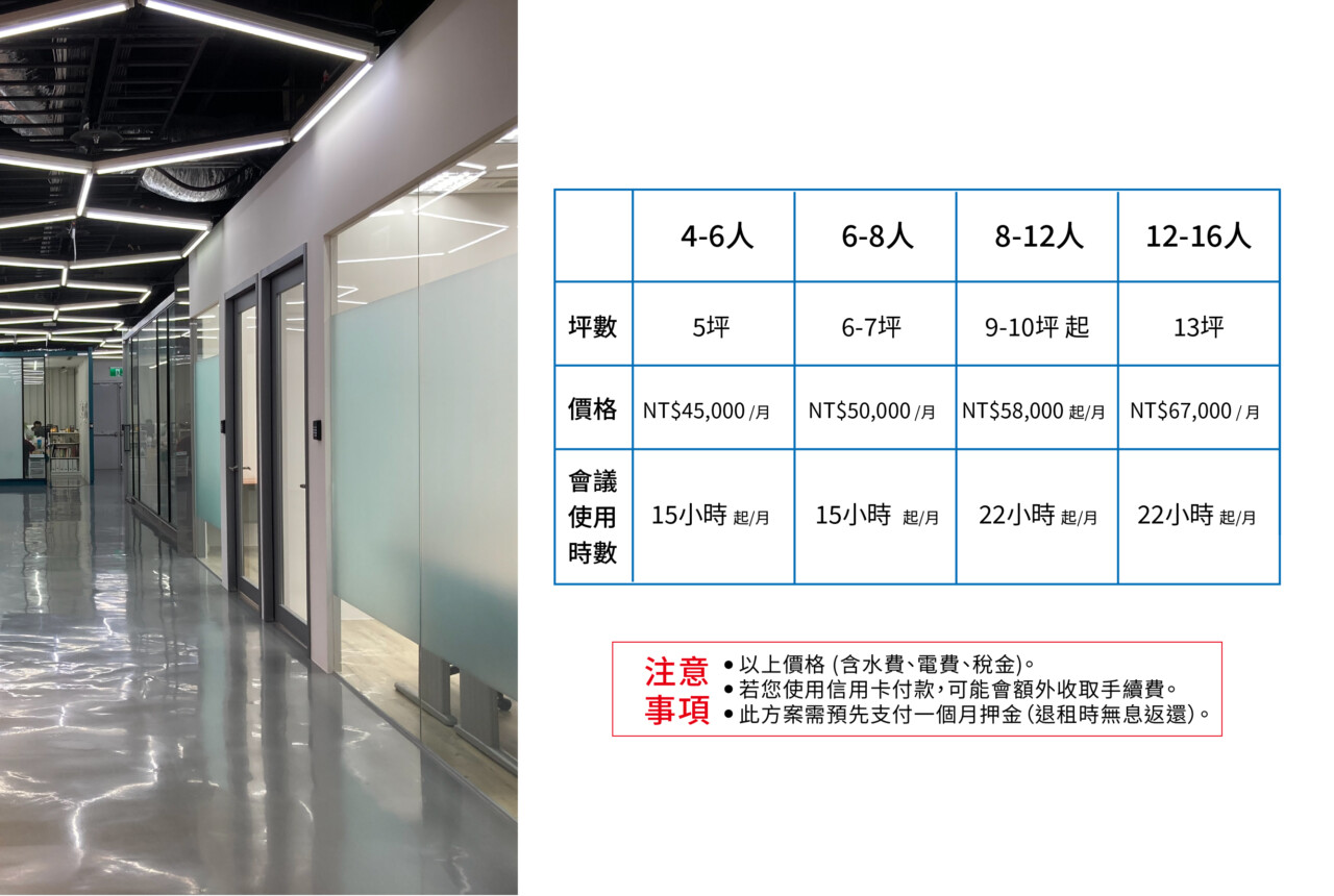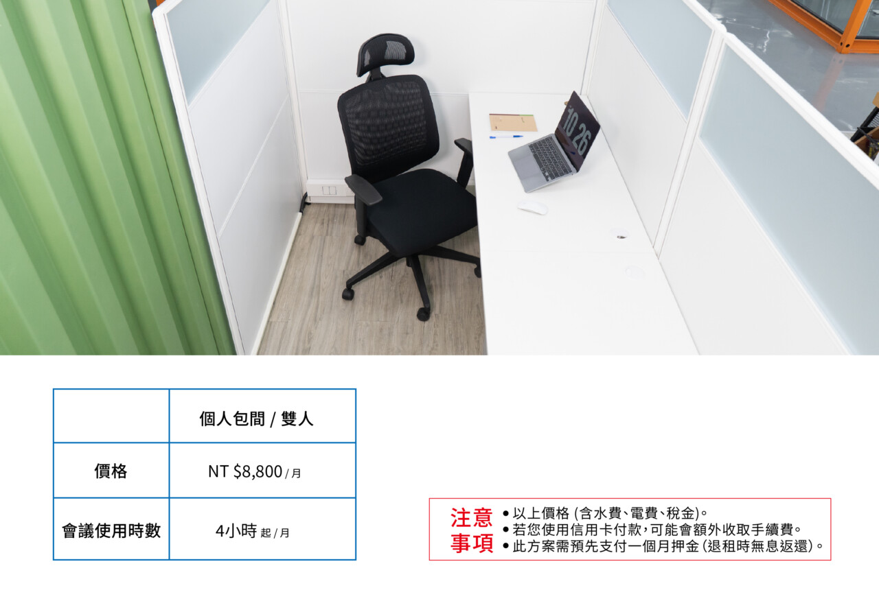 工作空間 獨立辦公室 專屬工作空間,適合新創、科技或企業團隊使用,確保隱私與安靜環境。 半開放隔間 採用OA屏風區隔工作區域,兼具隱私與開放感,適合需要專注工作的團隊或個人。 個人座位 適合自由工作者或小型團隊,提供專屬辦公桌與基本設備。 個人包間 獨立且安靜的工作空間,適合專注辦公或遠端會議使用。配備基本辦公家具,兼具獨立辦公與便利資源。